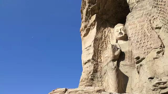 其实看石窟不仅仅是为了看石窟的外表造型,重要的是要了解石窟的修建历史。云冈石窟中第16到20窟前,有“昙曜五窟”。这五个窟是云冈最早开凿的洞窟,主像高度都在13米以上,身躯高大、气势雄伟,分别象征着北魏的五个皇帝,因为是由一位叫昙曜的和尚主持开凿的,所以也叫昙曜五窟。