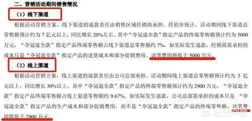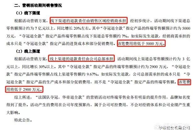 活动期间线下渠道总零售额预计约为 7 亿元以上,同比增长 20%左右。其中“夺冠退全款”指定产品的终端零售额预计约为 5000万元,“夺冠退全款”指定产品终端零售额占线下渠道总零售额约 7%。如之前公告所示,该部分退款由销售区域经销商承担。
