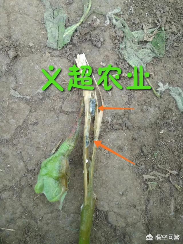 (2) 茎上发病初期,出现不规则的水溃状病斑,后变褐色至灰白色。
