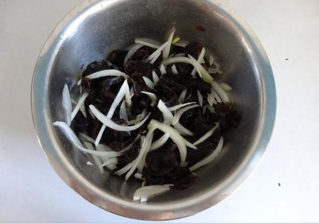 洋葱切丝,香菜洗净切碎;将洋葱丝和木耳先拌在一起,少放一点盐拌匀;