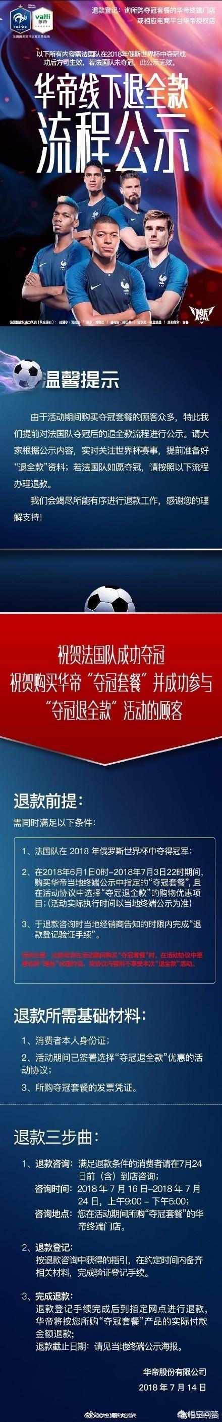 恭喜法国队拿下大力神杯,也恭喜华帝世界杯这波营销神操作。华帝世界杯的营销肯定是值得,这个营销事件值得载入史册,2018俄罗斯世界杯最成功的一个营销方案,没有之一。随着世界杯的圆满落幕,我觉得华帝才是这届世界杯的预言帝,在比赛开赛前,华帝就公布了“法国队在2018年俄罗斯世界杯夺冠,华帝将对在2018年6月1日0时至2018年6月30日22时期间对购买了华帝"夺冠套餐"的消费者,退产品发票金额的全款。”这则公告。
