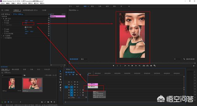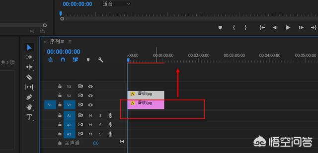 7.选择素材,按住键盘上的Alt键不放,向上拖动复制一份。然后同样的方法将下面的素材放大,占满整个序列显示窗口。