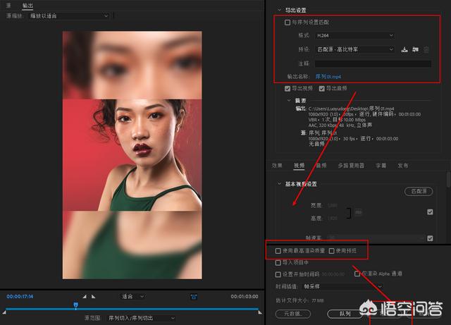 10.格式选择H.264(导出来是MP4格式),点击【输出名称】设置导出位置和文件名称,然后尽量勾选【使用最高渲染质量】,最后点击【导出】就开始输出视频了。