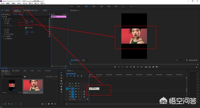 6.选择时间轴的素材,然后找到左上角的【效果控件】,然后打开【运动】,设置里面的【缩放】,将画面缩放到合适大小。