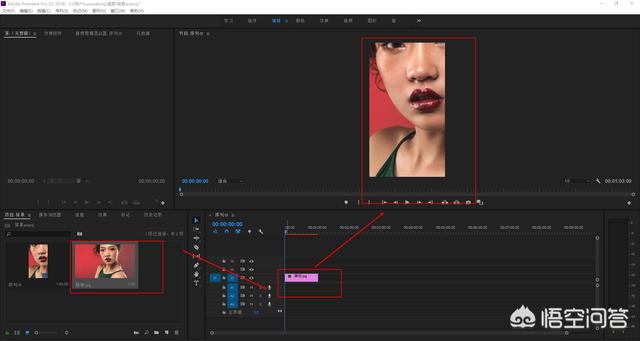 5.将素材拖到时间轴,这时候序列窗口就会显示素材内容了。因为我的素材分辨率大于序列的帧大小,所以只能看到局部。