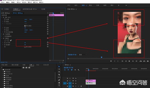 8.到左下角的效果面板找到【马赛克】效果。然后选择拖动,放到时间轴下面的素材上面,就添加了一个马赛克效果。然后在效果控件面板设置马赛克的水平块和垂直块。数值越大,马赛克就越多,尽量数值一样,马赛克就是方形的。整个效果就出来了。