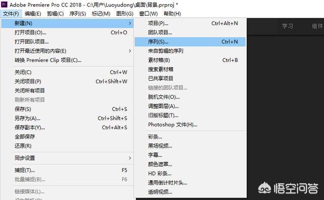 2.选择菜单栏的【文件】-【新建】-【序列】。