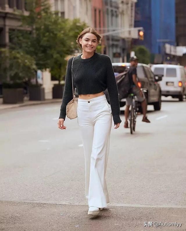 白色毛衣除了和蓝色牛仔裤混搭,和黑色长裤当然也最常见,像下面的白色毛衣有点长的话,可以把前摆稍稍掖在裤腰里,露出腰线 才显高挑哦!