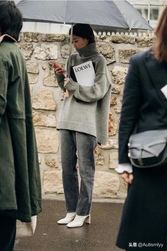 2.高领毛衣做为内搭的时候,更能衬肤色显气质。下装的变化也可以更多,可以是奶奶裤,休闲裤,短裤都能出场。脚踩毛毛鞋,英伦范单鞋,妥妥地当一枚时髦精。