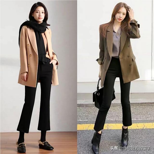 天气再冷一点小西装可以换成呢子面料,内里搭配衬衫或者打底衫,配合显瘦黑色微喇裤,秋冬通勤英气有气质。