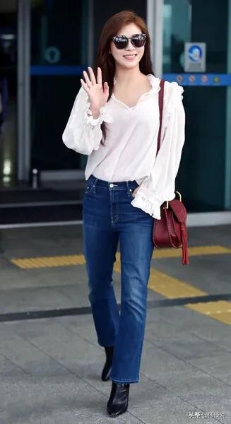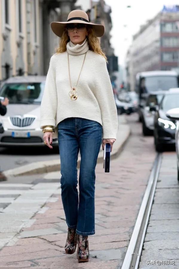 微喇叭牛仔裤这两年又开始登上时尚舞台,它可以增加人体的曲线感,但是搭配不当也会上下不平衡,显得不好看。