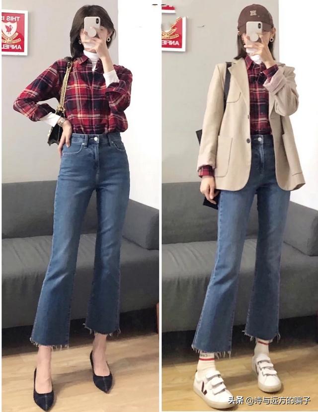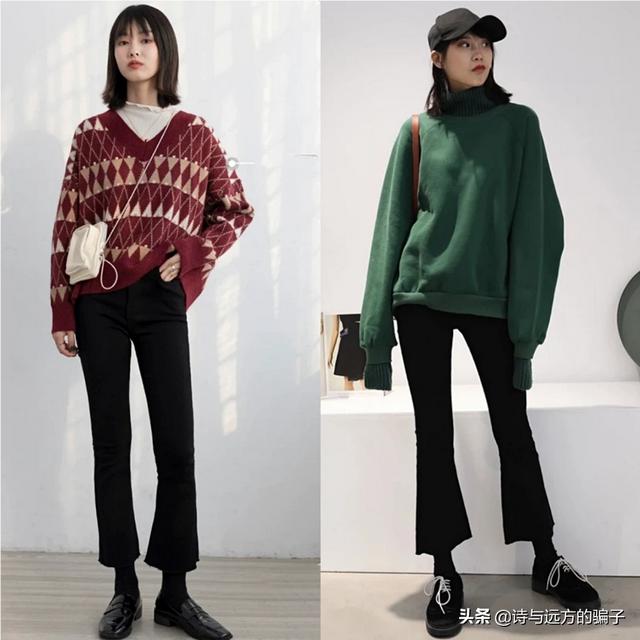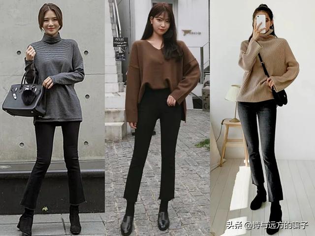 搭配再升级一点,毛衣或者卫衣叠穿中高领打底衫,让整身造型层次感升级,同时上衣稍微宽松得版型搭配下身大腿紧小腿微松的微喇酷,休闲随性显瘦时髦。