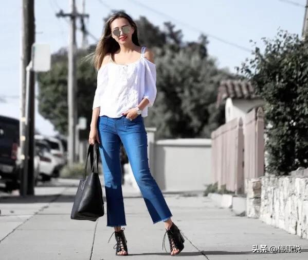 牛仔裤是永不过时的单品,它怎样搭配都能穿出时髦感,这个夏天选择这一条微喇叭裤,穿上显高身材,还很酷帅哦,阔腿版型,遮肉显瘦,上身搭配一字肩T衫,灯笼袖设计遮手部肉肉,很性感,这样穿出门美炸了。