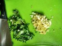 4.将香菜、小葱、蒜切好备用,如果不喜欢吃香菜和葱也可以不用