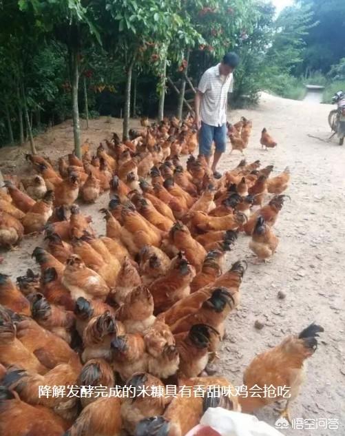 通过步骤二的降解发酵处理后,米糠变得非常香甜可口,加上鸡是喜甜食动物,直接将降解发酵米糠喂鸡都疯狂抢吃,这时候一定要注意用量,因为降解发酵米糠中含有酒度,初次饲喂过量使用容易导致酒醉。