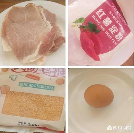 所需材料:猪排肉(或里脊肉),一个鸡蛋,淀粉,面包糠,少许盐