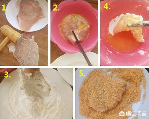现将猪肉洗干净,切成一指厚的肉片,然后用锤子将肉拍松(如图1),然后将鸡蛋打散,蛋液中撒入少许盐,将拍松的肉片放入蛋液中,肉片两面都沾上蛋液(如图2),然后放入淀粉中裹满淀粉(如图3),再放回蛋液中二次裹满蛋液(如图4),最后再放入面包糠中粘上厚厚的一层面包糠,再用手将面包糠压压紧实(如图5),