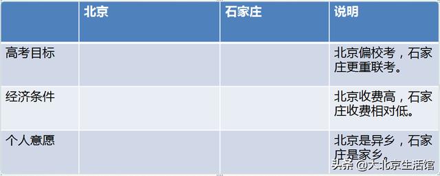 再次要征求孩子本人的意见。集训换句话也是学习,主观能动性很重要,看看其自身的意愿是什么。比如他(她)很多同学在北京,觉得北京氛围好,就去北京;觉得石家庄氛围好,留在石家庄,只要足够努力,再加上老师的指导,成绩也未必差。