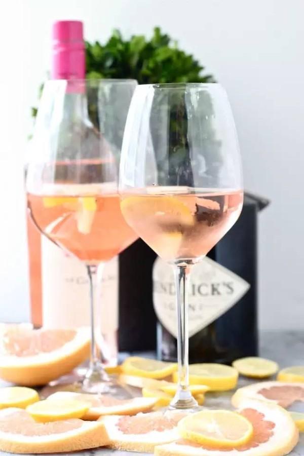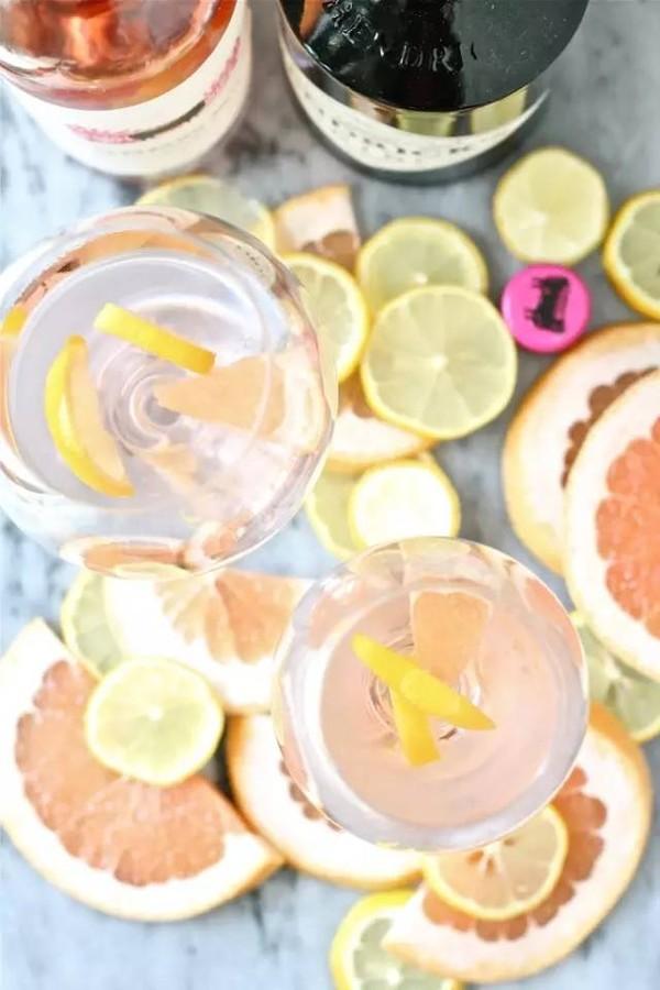 ① 将柠檬片、柚子片和冰块、葡萄酒、金酒摇匀,加入糖浆调至适宜甜度。