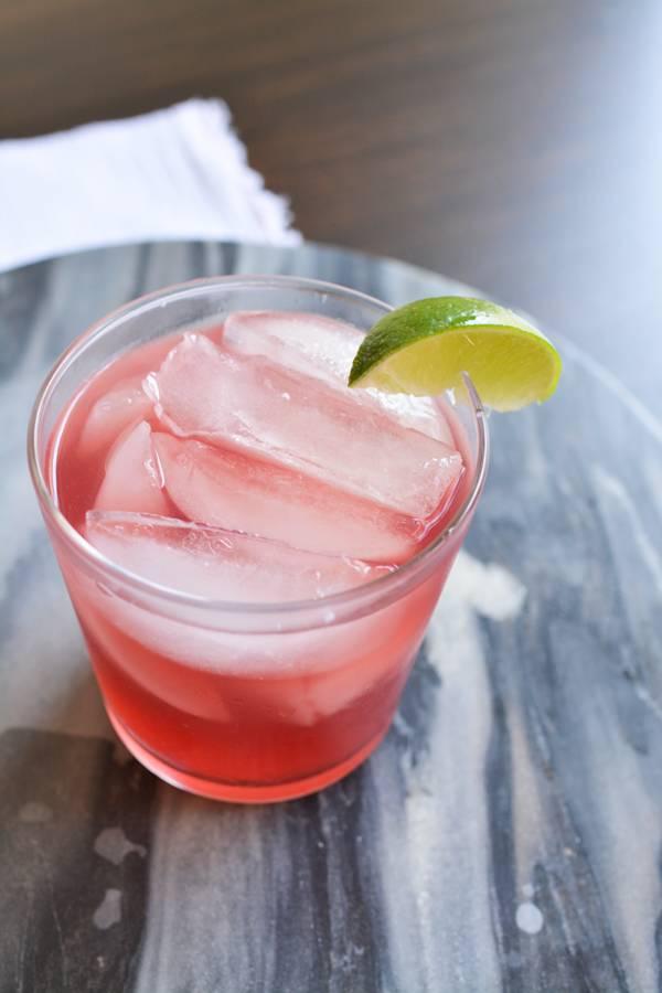 ② 倒入装满冰的杯中,以青柠块装饰即可。
