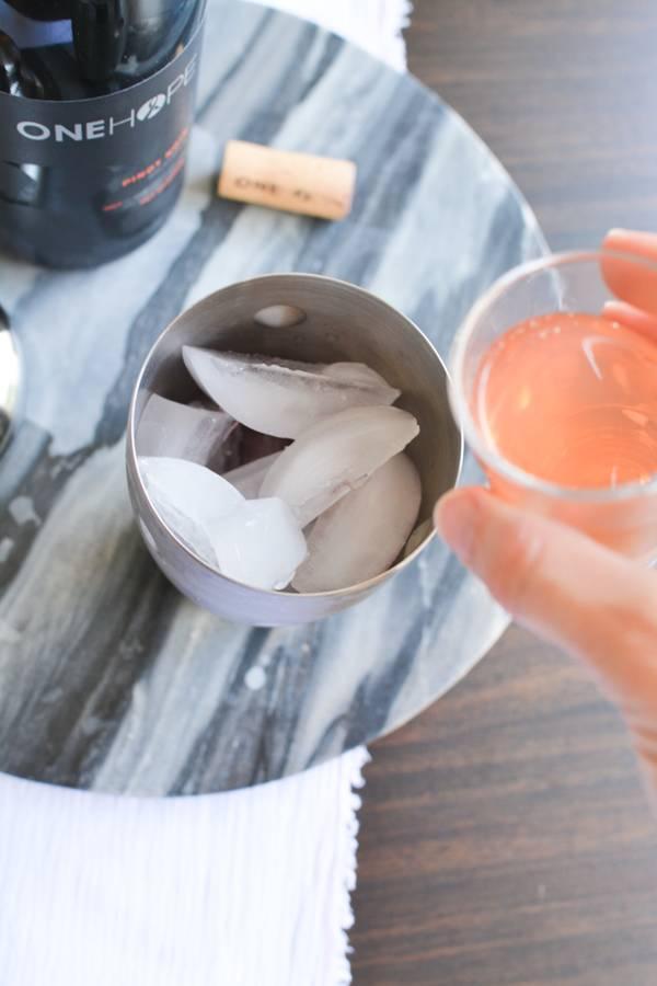 ② 倒入红酒杯,用柠檬片和柚子片装饰即可。