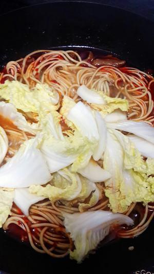 4.面粉30斤加水18斤擀成面索,再揉和均匀,用灰水7两(如果灰水浓则少加,灰水淡则多加)搅和揉匀。案子上擦抹清油,将面搓成条,揪为重五两的条,上面盖上湿条布,然后根据每个人善食的爱好,分别拉成大宽、韭叶、二细、芥麦棱(三角条)一窝丝等形状的面条下锅,面熟后捞入碗内,将牛肉汤、萝卜、肉丁、浮油适量,浇在面条上即成。并以每个人的口味加上适量的香莱、蒜苗、葱花及辣子油。