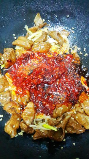 把食材拔到锅旁边,放入一勺豆瓣酱和半勺老干妈炒出红油。