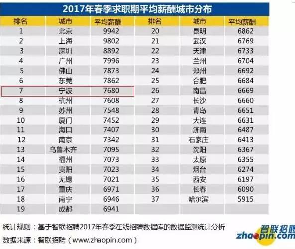 今年智联招聘曾经发过一个宁波城市求职的一个工资水平,里面宁波的平均薪资达到了惊人的七千六百元左右,在全国所有城市中名列前茅。当然这个七千六百元是很多人“被平均”之后的数据,但也由此可以看出宁波的工资水平不算低的。总体上来说,可能更多的人的工资集中在四五千元左右。