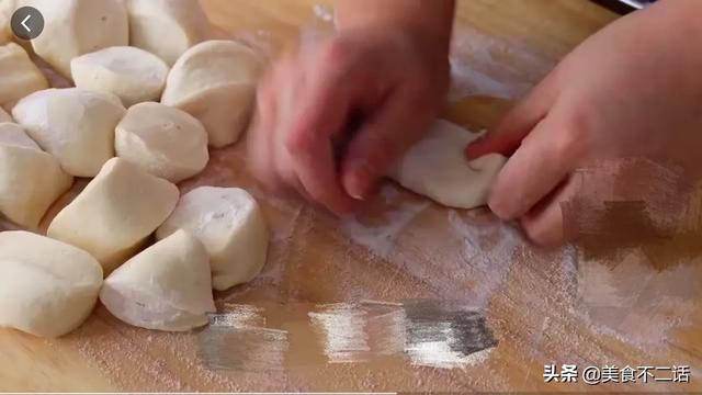 7包馅:将面团搓成长条,分成大小相同的剂子,用擀面杖擀成中间厚两边薄的样子,包入拌好的馅料。