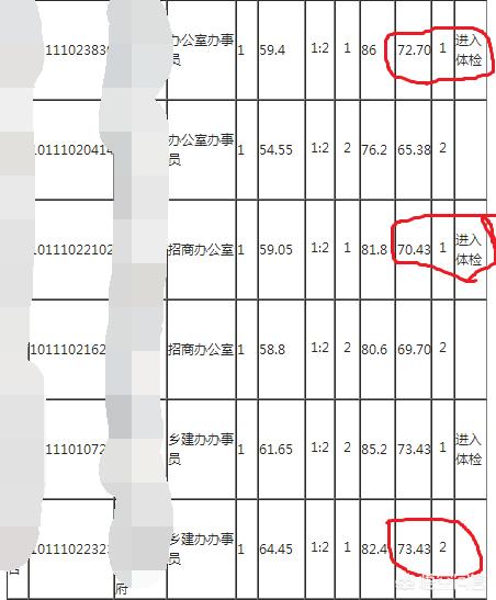 这是我那年的进入体检名单,可以看到最后一个红圈,没有进入体检的比上面连个进入的分数还高,这说明上面两个职位的竞争者实力一般。
