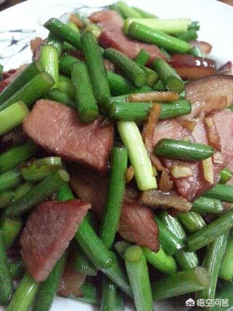 取一块晒制好的腊肉,切片后和蒜苔一块儿翻炒就可以了!