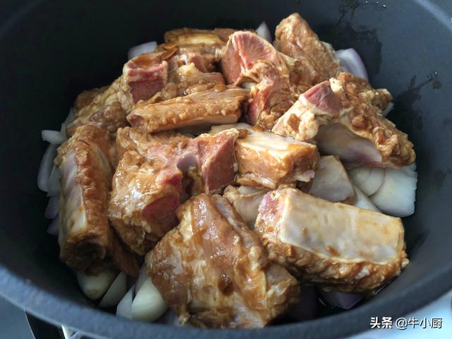 5.把腌制好的排骨倒进去,平铺在洋葱和大蒜粒上,注意排骨不要紧贴着锅边。