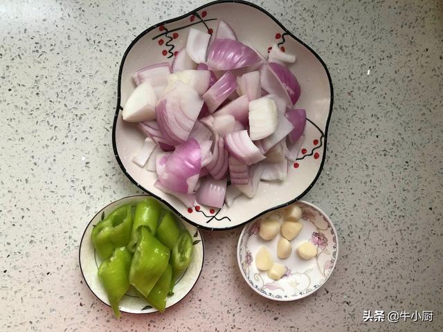 3.趁着排骨腌制的工夫,准备一下辅料,洋葱去皮切成洋葱块,大蒜切小粒,青辣椒切段儿,备用。