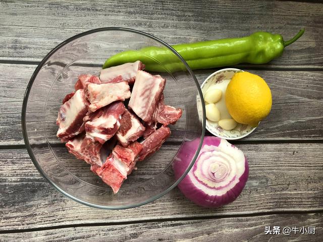 一.准备所需要的食材和辅料排骨、洋葱1个、青辣椒一根、大蒜少许、柠檬1个、蚝油、生抽、料酒、十三香、豆瓣酱