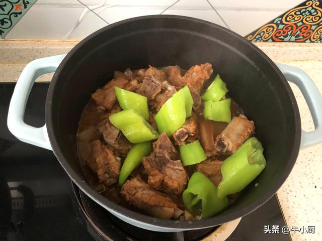 6.盖上锅盖,开小火先炖30分钟,30分钟后打开锅盖,倒入青椒段儿,继续小火再炖20分钟。