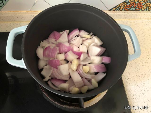 4.将切好的洋葱和大蒜粒均匀的平铺到锅底,这样可有效的防止粘锅。