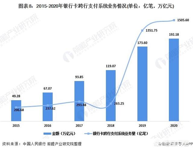 银行卡跨行支付系统业务量保持增长。2020年,银行卡跨城支付系统共处理业务1505.60亿笔,金额192.18万亿元,同比分别增长11.38%和10.70%。日均处理业务4.11亿笔,金额5250.95亿元。