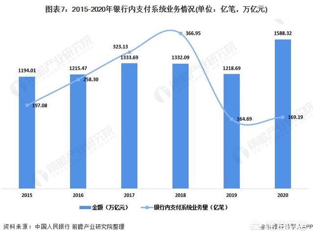 银行行内支付业务金额增长较快。2020年,银行行内支付系统共处理业务169.19亿笔,金额1588.32万亿元,同比分别增长2.73%和30.33%。日均处理业务4622.58万笔,金额4.34万亿元。