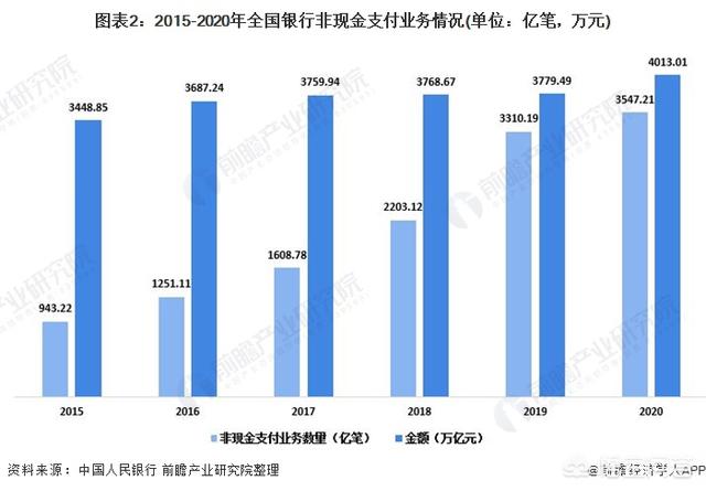 2020年,全国银行共办理非现金支付业务3547.21亿笔,金额4013.01万元,同比分别增长7.16%和6.18%。