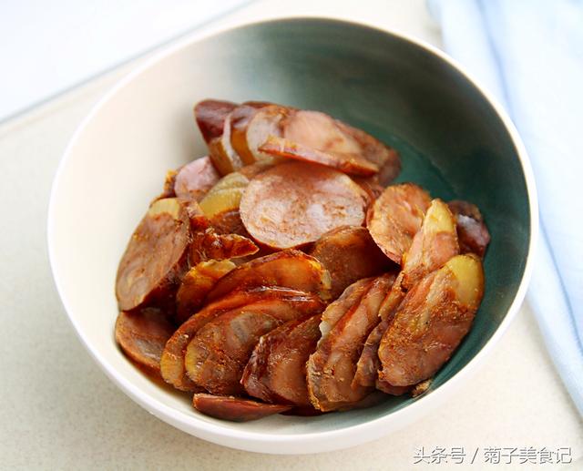 ▼1、腊肠切片:腊肠先上锅蒸15分钟,再切片待用。如图