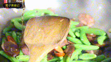 ▼4、依次倒入青豆、小米椒、腊肠翻炒均匀!最后起锅前放入料酒再次翻炒均匀即可。