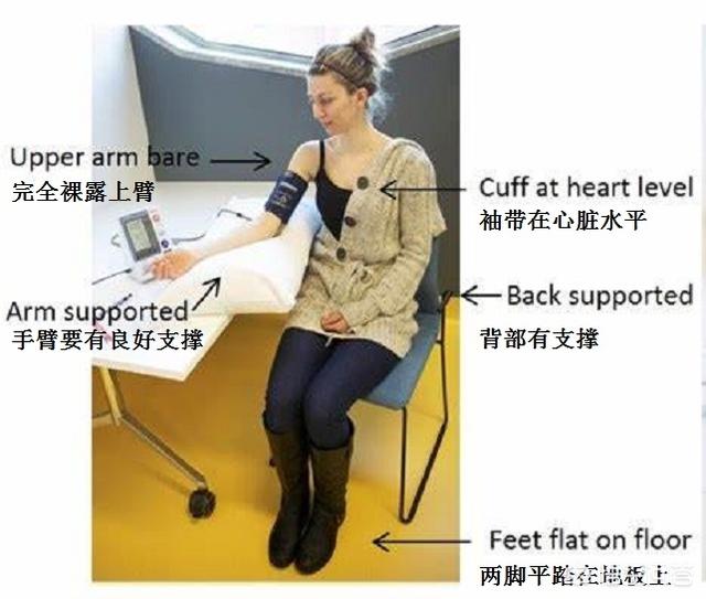 测量时,患者应该舒适地坐在有靠背的座椅上,背部靠在靠背上;绑袖带的上臂应该置于有支撑的平面上,处在心脏水平;双脚平放在地板上。