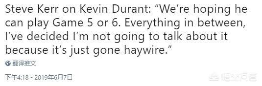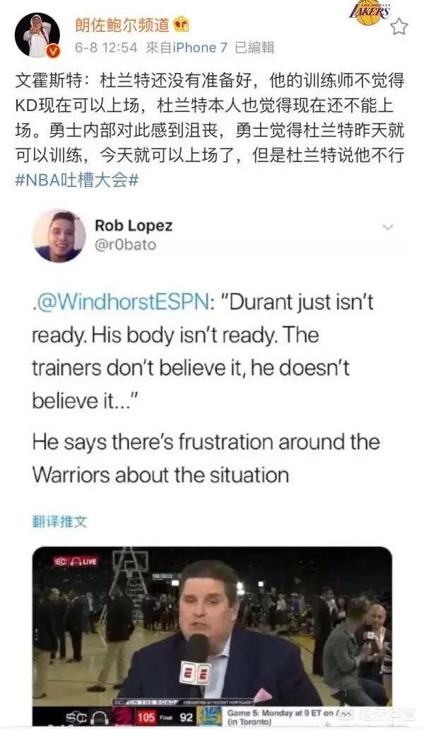 在这场G4的赛前,史蒂夫-科尔曾提到了杜兰特的伤情,他说道:“杜兰特G4不会打,他希望杜兰特在G5或G6中复出。”而《圣塞水星报》记者马克-麦地那报道,虽然科尔希望杜兰特在G5或者G6复出,但是他没有给出任何杜兰特伤情的更新,不清楚杜兰特什么时候参加队内对抗赛。也就是说杜兰特能否在G5复出还是一个未知数,可在这场G4正在进行时,ESPN分析嘉宾杰伦-罗斯这样说道:
