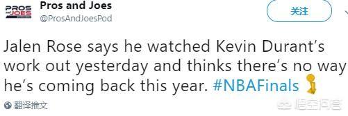 昨天早些时候,勇士队主教练科尔在接受媒体采访时表示:“杜兰特有可能在G5或者G6的比赛中复出”,但是根据NBA前方记者传回的消息称:“杜兰特的恢复情况并不像科尔说的那么乐观”。今天这一消息几乎得到了证实,前NBA球员、现役评论员杰伦·罗斯公开表示:“亲眼观看了杜兰特的训练,结果并不理想,不认为他会在总决赛中复出”。