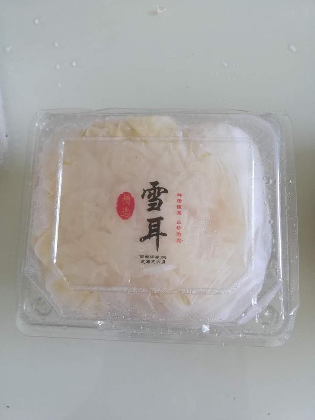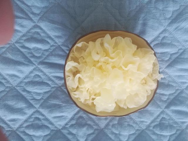 2.将银耳用温水泡开,除去中间的老蒂,撕成小朵。