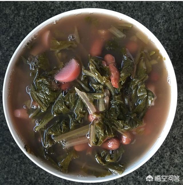 贵州的酸菜做法很简单,嫩青菜、萝卜菜或油菜洗净,烧一大锅开水,将菜稍微烫一下取出来,放进干净的酸菜坛中压紧,反扣将多余的水倒出来,再用一勺面粉煮一大锅面粉水趁热倒进去浸过青菜,去邻居家要一碗老酸汤倒进去,盖上盖密封,放在火炉旁保温,一、二天酸菜就做好了。做好的酸菜切小段、加上煮好的粉糯的花腰豆,就是贵州出名的酸菜豆米汤,再配上腊肉、腊排骨、油渣一起煮就是很受欢迎的酸菜豆米火锅。贵州酸菜微酸因发酵时间短,多用嫩青菜做酸菜,酸汤菜可荤可素生津开胃,消脂解腻是贵阳、毕节一带的家常菜。