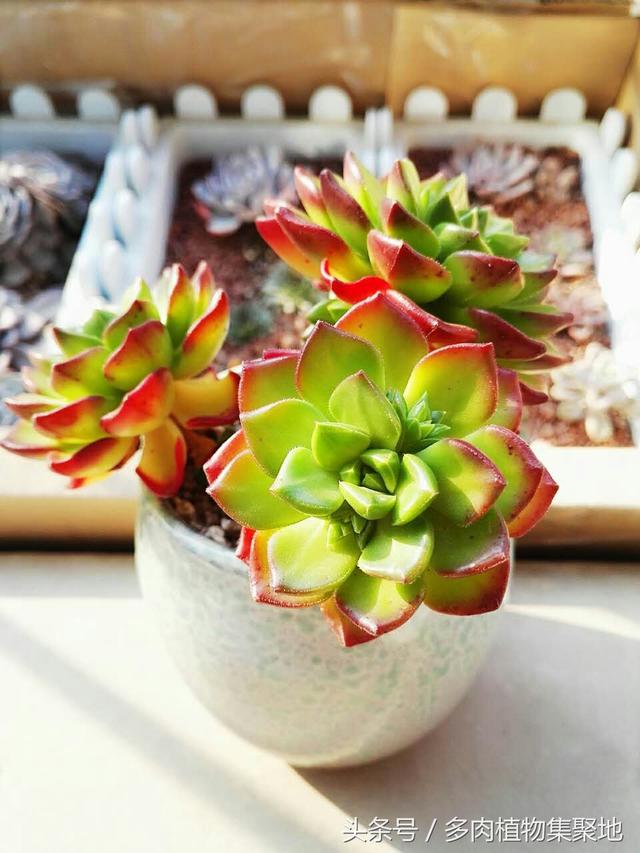 之后将换好盆的多肉放在通风晒不到太阳的角落里,大约一周后,移到散光处,沿盆壁浇少许水,等过几天看到叶片精神饱满了,证明换盆成功,可以逐渐晒太阳正常养护了。