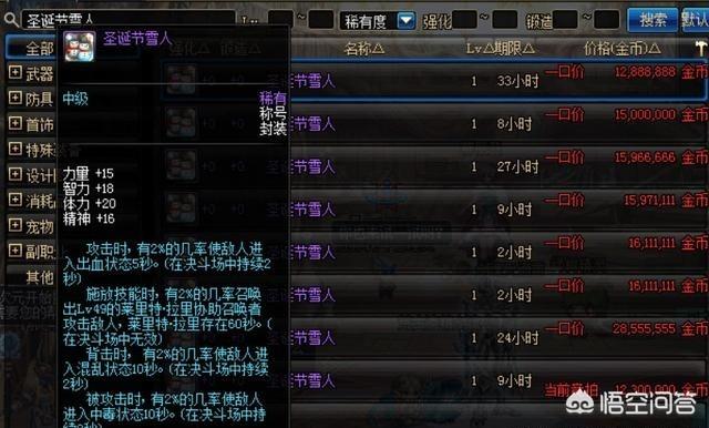 如果没有粉红大叔,可以在自己称号栏找找看有没有死神的邀请、怪物猎杀者之类的,这些也都可以召唤人偶,还是没有那就只有拍卖行了,比如下面这个圣诞节雪人称号,虽然作用不大,但是价钱可不便宜,1000多万啧啧啧……还不如直接坐金团呢。