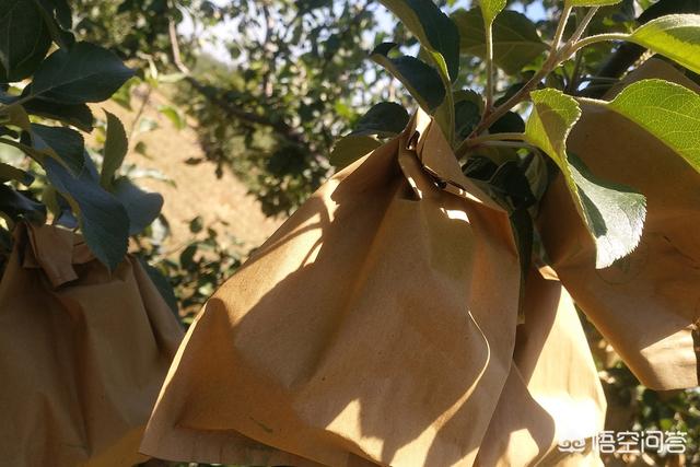 红富士苹果套袋选择的是蜡纸(外面一层是牛皮纸,里面一层是红色的蜡纸),相比较以前的那种里面是黑色的塑料纸来说,对于苹果上色、防止苹果烧伤有很多的好处。所以现在都流行这种。