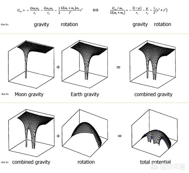圆型限制性三体问题是太阳系中椭圆轨道的合理近似,它可以看作是由于两个主要天体的引力以及它们自转所产生的离心效应而产生的势的组合(科里奥利效应是动态的且不显示出来)。拉格朗日点就可以看做是五个合成表面上梯度为零的地方(如蓝色线条所示),这表明那里的力是平衡的。历史上,第一个典型的被广泛研究的三体问题是涉及月球、地球和太阳的问题。